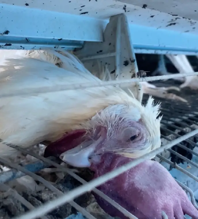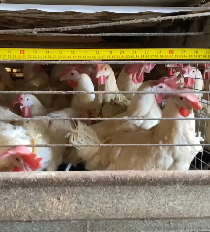 Em gaiolas minúsculas, as galinhas eram impedidas de pisar em solo firme, mover-se livremente ou abrir as asas, apertadas com até 16 outras em uma mesma gaiola.